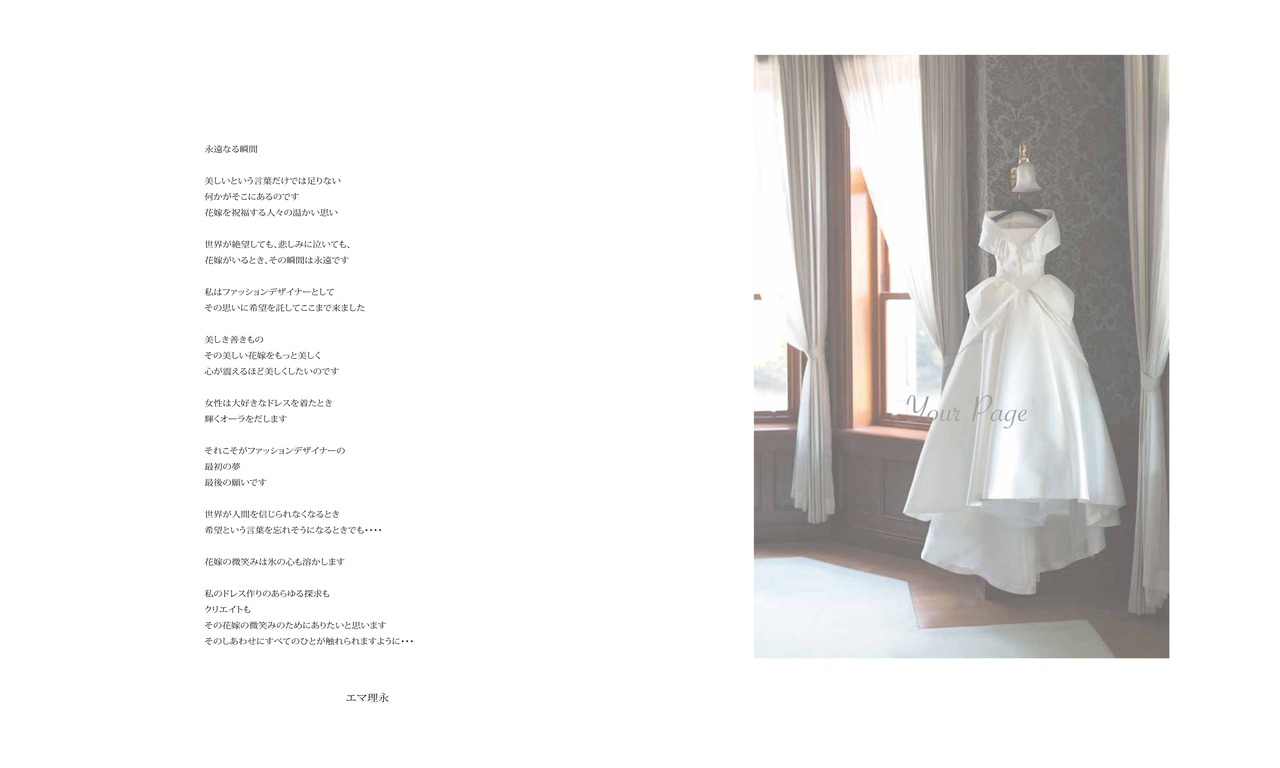 花嫁の夢を形にする、私たちの想いが詰まった一冊。このブランドブックは、ドレス一着一着に込められたストーリーや、デザイナーのこだわりを美しく表現しています。トレンドに左右されないタイムレスな美しさや、上品で洗練されたスタイル。特別な日にふさわしい、本物の輝きを求める花嫁様へ向けた、唯一無二のコレクションブックです。
